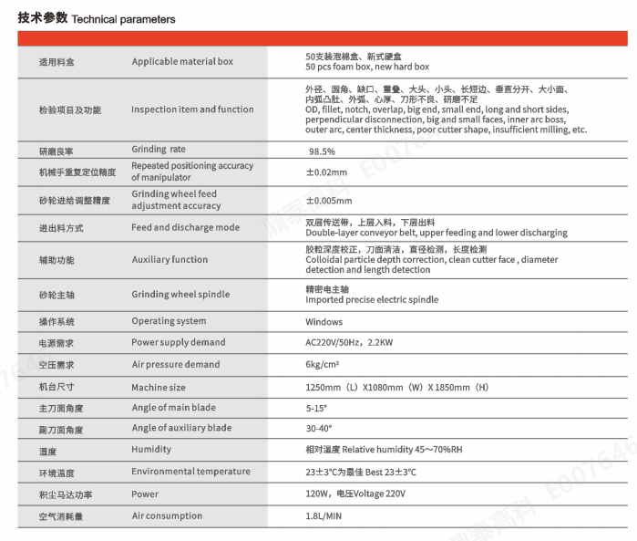 具備刀面清潔,環深校正,全自動上下料,輸送帶式收料,不良品回收等多項功能。
